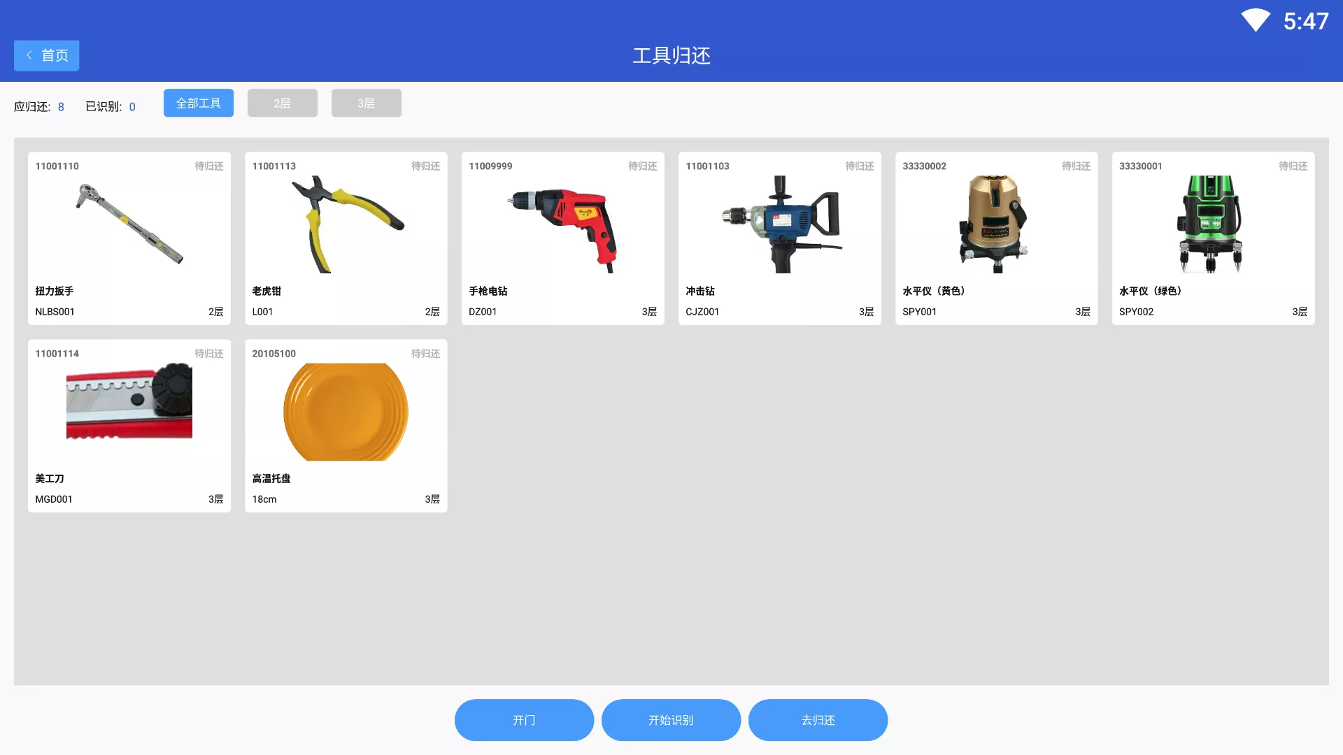 1、自動打開門柜放置指定工具,關門自動識別。